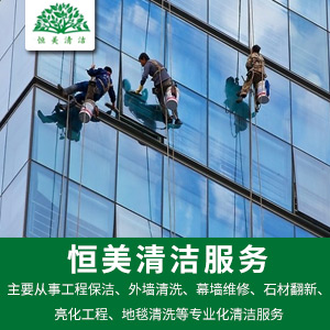 公司擁有各類專業(yè)化管理人員,主要從事工程保潔、外墻清洗、幕墻維修、石材翻新、亮化工程、地毯清洗等專業(yè)化清潔服務。